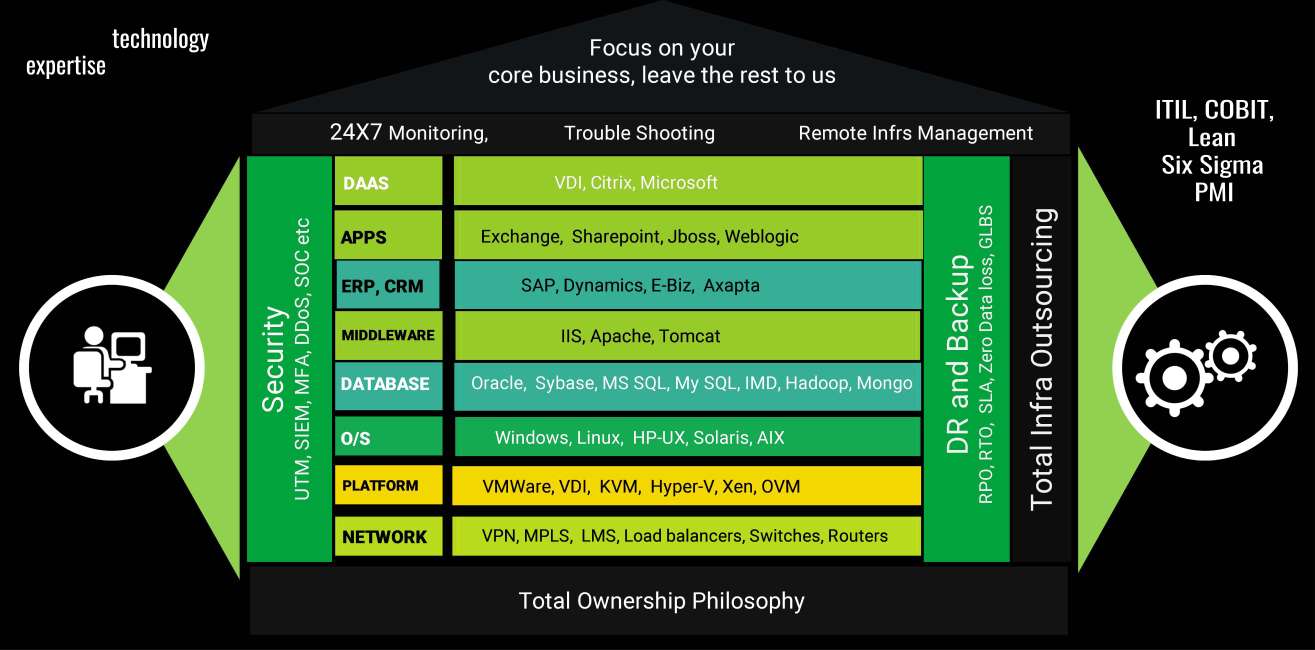 Our Managed Services portfolio provides management of your currently deployed infrastructure so that you can focus on your core business and enhance agility, reduce cost, and provide you absolute peace of mind.